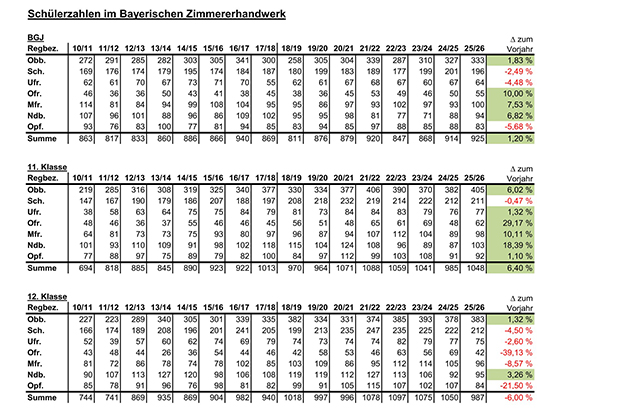 Eine Ausbildung im Zimmererhandwerk ist für junge Menschen nach wie vor attraktiv. Seit dem Schuljahr 2020/21 können wir in Bayern immer über 2900 Lehrverhältnisse registrieren. In diesem Jahr meldeten uns die sieben Bayerischen Regierungsbezirke insgesamt 2960 Schülerinnen und Schüler.